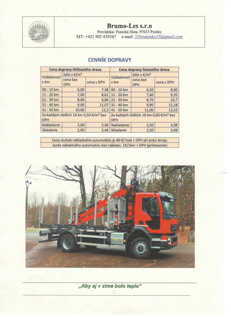 Brumo-Les s.r.o. cenník dopravy ihličnatého a listnatého dreva